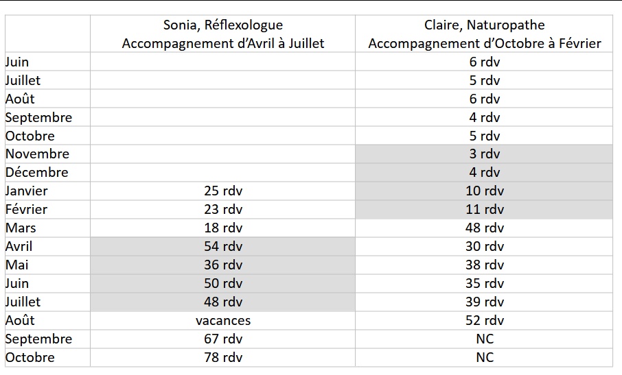 Voici l’exemple de deux personnes que j’ai accompagnées (période grisée).